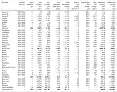 Table 1Summary table with data on each ice shelf, including area change from 2009 to 2019, the absolute difference, percentage difference, and rate of change between the first and last recorded dates (ice shelves that have experienced major calving events are indicated in parentheses), the year and amount of maximum area change, and the observed calving flux and steady-state calving fluxes. The values denoted in bold format are to indicate that those values are sums of ice shelf groupings (aka AP total, WAIS total, EAIS total, large shelf total, and Antarctica total).