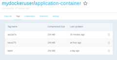 def push_container system("docker push #{APPLICATION_CONTAINER}:#{current_git_rev}") endこのメソッドは、Docker Registryに新しいコンテナをアップロードします。最新のコミットハッシュをgitで取得しているこのcurrent_git_revメソッドにご注目ください。各デプロイの識別にはこのコミットハッシュを使います。アップロードしたコンテナはすべてDockerHubコンソールで確認できます。