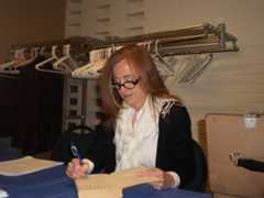 Author Mona Simpson signs a copy of one of her novels following a reading and discussion as part of the English Department’s “Great Writers, Great Readings” series in the Cultural Center Theater. (Jillian Lipari/The Chronicle)