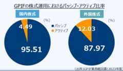 たとえば、GPIFの『株式部門』のパッシブ運用(インデックス運用)比率は、国内株式で95.51%、外国株式で87.97%となっています(2024年3月末時点)。