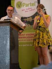 Die Delegierten wählten ein engagiertes, junges Team, das mit Simon Klopstock in den Wahlkampf zieht. Vorausgegangen waren spannende Reden vom BundesvorsitzendenRoland Wegner und anschließend den Kandidaten. Für die Delegierten war es vor allem für die Spitzenkandidatur nicht leicht, da gleich drei Bewerbungen vorlagen. Das Rennen machte dann der 26-jährigeSimon Klopstock aus München. Ihn zeichnete sein erfolgreiches Engagement als Vorsitzender des Bezirksverbandes Oberbayern bei der Organisation der Landtagswahl in Bayern aus. Neben seinem Studium der Politikwissenschaften arbeitet er in der Jugendhilfe. In seiner Rede machte er deutlich, dass er auch ein Vertreter der jungen Generation im Europäischen Parlament sein möchte. Dazu passt, dass bei der Europawahl zum ersten Mal schon ab 16 Jahren gewählt werden darf. Auf Platz 2 folgtC. Beck. Die Bundesgeneralsekretärin und Landesvorsitzende von Bayern ist Projektmanagerin für Digitalisierung und bringt vielfältige Erfahrungen in internationalen Beziehungen mit. Sie hat sich bisher mit ihrer sachlichen Art in der inneren und äußeren Organisation der V-Partei³ verdient gemacht und ist an vielen Beiträgen auf Social-Media mitbeteiligt. Listenplatz Nr. 3 ging anAlexandra Munir-Muuß. Die frühere Bundesschatzmeisterin war zuletzt als Unternehmerin in Frankfurt erfolgreich, verlagert aber aktuell ihren Lebensmittelpunkt nach Niedersachsen. Sie setzt sich schon viele Jahre für sozial Benachteiligte ein.