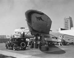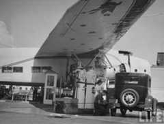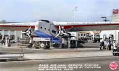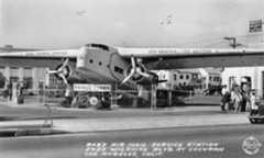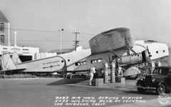 Historical Notes This is Bob's airmail service gas station, which stood at 5453 Wilshire Blvd, at the corner of Cochran Ave. The plane is a 32-passenger Fokker F-32, which was a white elephant of an aircraft that never really worked right. They were probably going cheap so that when in 1934, Bob Spenser got the idea to build a Mobil gas station around one, Fokker probably said, “Here! Take it!” It sure must have been eye catching because in 1934, Bob's Air Mail Service Station sold more Mobiloil and Mobilgas products than any other dealer on the West Coast. |
