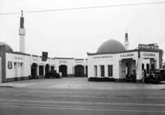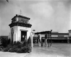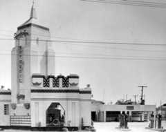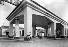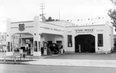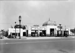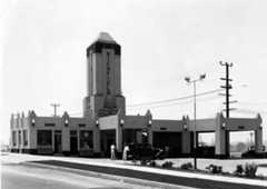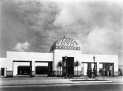 Historical Notes The station's popularity soared throughout the 1920s and 1930s, growing to cover three acres at the busy corner of Sunset and Cahuenga and employing over 100 workers by 1937. Its location and customer-focused model attracted many Hollywood celebrities, including Rudolph Valentino and Clark Gable. In 1936, a major renovation introduced Streamline Moderne architecture designed by Douglas Hull McLellan and Allen McGill, aligning the facility with contemporary styles influenced by the Century of Progress World's Fair in Chicago. Some original Spanish-Italian style structures, such as the car wash, were retained alongside the new additions. |