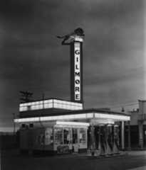 Historical Notes Today, you can find a replica of a gas station modeled after a 1936 era Gilmore Gas Station atFarmers Market. The 1936 replica and the one shown above are very similar. The station was put in place when the Grove Shopping Center was constructed adjacent to Farmers Market in 2002. In 1929, this Gilmore station was torn down to make room for theE. Clem Wilson Building. |