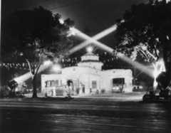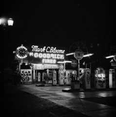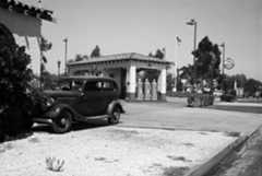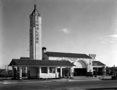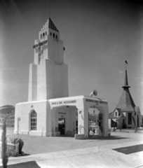 | (1942)+# – View showing the Mark C. Bloome Service Station located at 6210 Sunset Boulevard in Hollywood. This service station was on the S/W corner of Sunset and El Centro Avenue, just about opposite theHollywood Palladium. TheEarl Carroll Theatre is just to the right (west) of the station. |