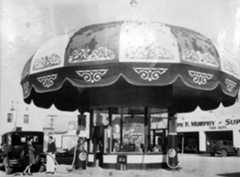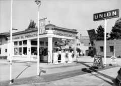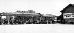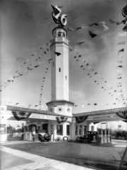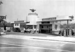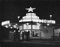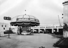 | (ca. 1930s)^^# – View showing an Associated Oil Company gas station whose premium gasoline was sold under the Flying-A brand. Taking a cue from drive-in restaurants, the building has a flying-saucer awning and glowing centerpiece for added height and visibility. |