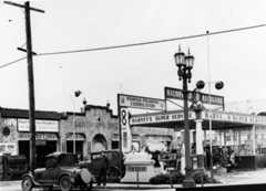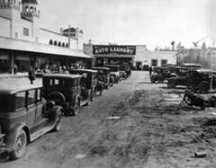 | (ca. 1927)* – View showing cars lined up at the El Patio Auto Laundry and Gas Station, located at the rear of 260 S. Vermont Avenue. The large building with the ornate towers on the left is the El Patio Ballroom (later theRainbow Gardens). |