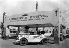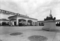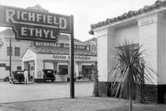 | (1929)^^ – Richfield Service Station at 7786 Santa Monica Boulevard, West Hollywood. Note the pedestal-mounted racecar on the right. |
