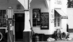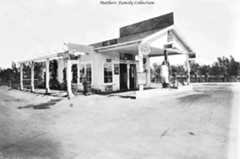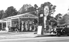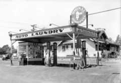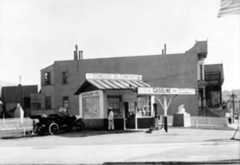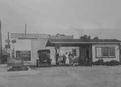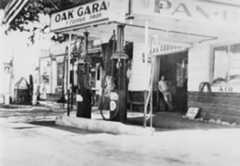 | (1920s)^ - View showing The Oil Well service station offering 1 qt. oil, free, with 6 gallons of gas. |