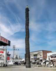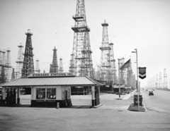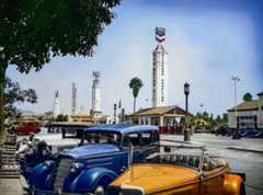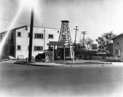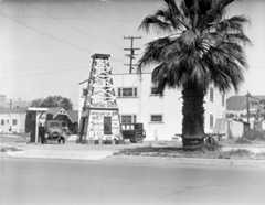 | (1920s)^ - The Oil Well service station shaped like an oil derrick, next to a palm tree and a two-story apartment building in Los Angeles. |