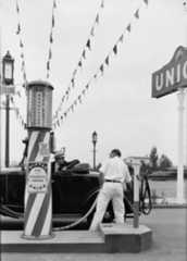 | (1931)^^ - Filling car with 'Volatile Vapor' at a Union gas station on Wilshire Boulevard with streamers from pump to sky. |