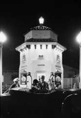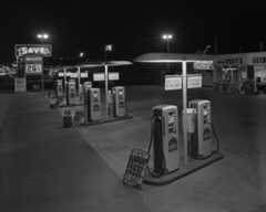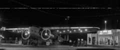 | (ca. 1938)*– Night view showing a man standing in between a Fokker F-32 aircraft with spinning propellers and the gas pumps at Bob's Airmail Service at 5453 Wilshire Boulevard. |