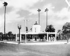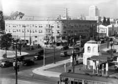 Historical Notes Note the streetlight on the corner with what appears to be a cap or hood on top of the light bulb. During World War II many streetlights throughout the City were blacked-out on top as a preventative measure. ClickHERE to see more in Early LA Streetlights. |