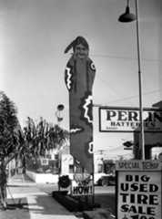 Historical Notes In the 1920s and 1930s, as the automobile was becoming the default way to get around the Southland, buildings and structures in the area became more unique. These “hey-you-can’t miss-me!” buildings (referred to as Novelty or Programmatic Architecture) were made to pull automobile drivers right off the road. ClickHERE to see more examples of Programmatic Architecture. |