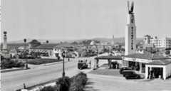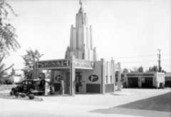 | (1938)^ – View showing Pitkin Brothers Service Station located at 1101 E. Valley Boulevard (El Monte, Los Angeles County). The building looks like a very large bird that’s about to take off. Photo by Julius Shulman |
