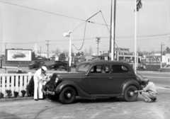 | (ca. 1936)* – An attendant checking the tire pressure as a woman looks on at Bob’s Airmail Service Station on Wilshire Boulevard. |