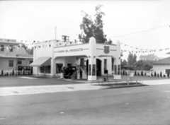 | (ca. 1929)* - Close-up view of the Texaco Station located at the Mandarin Market in Hollywood. Note the Pagoda-style design of the roof line. |