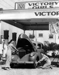 | (1942)^ - "Check your air, mister?" Nina Meloni, manager of the Victory Girls' gas station, and Verda Curtis, putting air in tires, work at the modern service station at 8th and Alvarado Streets, during World War II. Photo date: May 14, 1942. |
