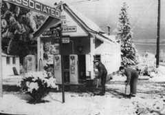 | (1949)#^*^ – View showing two men shoveling snow in front of an Associated Gas Station located on the NW corner of Topanga & Ventura boulevards. Photo date: Jan 12, 1949. Today, aChase Bank stands at this corner. |