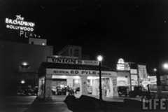 | (ca. 1932)* – Life Magazine photo showing a Union 76 Service Station located on the northwest corner of Selma Ave and Vine Street, which was previously a Richfield Station (see previous photo). Sign over pump reads “Super ED PYLE Service”. Neon lights shine in the background advertisingThe Broadway-Hollywood,Hollywood Plaza Hotel and theBrown Derby Restaurant. |