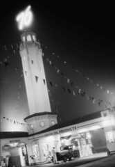 | (ca. 1932)^x* – Life Magazine photo showing a Union 76 Service Station located on the northwest corner of Selma Ave and Vine Street, which was previously a Richfield Station (see previous photo). Sign over pump reads “Super ED PYLE Service”. Neon lights shine in the background advertisingThe Broadway-Hollywood,Hollywood Plaza Hotel and theBrown Derby Restaurant. |