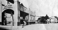 | (ca. 1930)*^ – View showing the Oak Garage and Gas Station with Frank Cooper standing in the doorway. In the background is the famousCalabasas "Hanging Tree". |