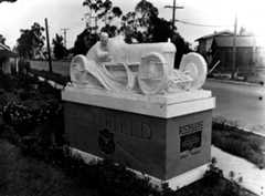 | (1926)^ - Photo of "Modern Speed," a statue by Finn Froelich located on Redondo Boulevard, near Inglewood. The words, "Richfield" is carved in large letters. Below it is a shield which reads, "Richfield, the gasoline of power." On the side, the words, "Richlube" is carved followed by "100% Pure Pennsylvania Oil." |