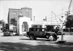 | (1920s)* – Closer view of what appears to be the same Standard Service Station as seen in previous photo. However, if you look closely, this station has two gas pumps and the building is positioned at a different angle on the lot. Also, there is no polar bear statue in this image. |