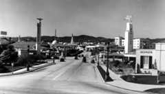 | (1940s)^ – View looking north showing the Hughes Brothers Gas Station with its Flying A sign located at 3rd Street and Olive Avenue in Burbank with the Verdugo Mountains in the background. |