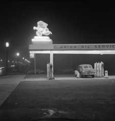 | (1940s)^.^ – A 1940 Chevrolet getting gas in a Union Oil service station on Wilshire Boulevard. Note the cute mascot lit up in neon on top of the canopy. |
