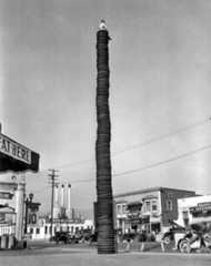 | (ca. 1928)* - Sitting on top of a stack of automobile tires at Muller Brothers Super Service Station at the corner of Sunset and Cahuenga Boulevards. |