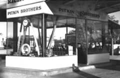 | (1938)^ – Close-up view showing the office at Pitkin Brothers Richfield Gas Station. Gas is selling for 14¢ per gallon. Both Good Year tires and Good Year spark plugs are being sold here. |