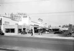 | (1930)* – View showing the El Patio Auto Laundry and Gas Station as seen from across Vermont Ave. A large sign reading “Patio Ballroom” is seen on the left. |