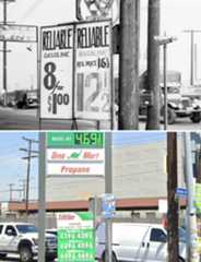 | (1941 vs. 2025)* – Gas prices at the same corner, 84 years apart. Reliable Gasoline once stood at the northwest corner of Vernon Avenue and Alameda Street—today, it’s a Sinclair station. Photo comparison by Jack Feldman. |
