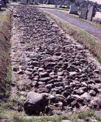 These portions of the ancient wall were exposed in 1903 and 1922, duringexpansion of the cemetery. The Antonine Wall at this location was originally4.3 meters wide, but portions found at Hillfoot were later widenedto 5 meters. Each of the exposed basal sections has outside rows oflarge dressed curbstones and a drainage system.