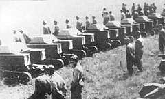 By the end of the 1920's, new rules and regulations for the Red Army were introduced. The regulations defined the future development of the domestic armored fighting vehicles, and in particular they stipulated the "development and manufacture of a small reconnaissance tank" that was intended for co-operation with the MS-1 tanks as well as for reconnaissance and for communication purposes. In the period of 1927 to 1930, the Design Bureau of the VOAO ("Vsesouznoe Orudijno-Arsenal'noe Ob'edinenie" - "All-Union Arsenal Association") designed several tankettes based on the chassis of the T-16 light tank: the T-17, the T-21 (only a paper project), the T-23, and the T-25 (paper project). The T-23 was designed in two variants: one with a turret, and the other turretless. The T-25 was a modernized variant of the T-17 tankette. All of these vehicles were quite good for the time, although they had many flaws. These defects would have taken a lot of time to correct, and because of this, the idea came up to buy a license for the Carden-Loyd Mk IV. In 1930, the Soviet Union bought the first batch of 26 original Carden-Loyd tankettes from Britain. In the Soviet Union, these vehicles were re-named the 25-V (some archive documents name them the K-25). Also, the Soviet Union bought a license to mass produce these vehicles. According to the production plan, in 1930 to 1931, 290 tankettes had to be manufactured, and after that 400 tankettes per year. The manufacture was set up in the Autozavod #2 VATO in Moscow (in 1932, this factory was renamed to Factory #37). However, Soviet engineers weren't fully satisfied with the original Carden-Loyd tankette and before its mass production they significantly modernised it (the Chief Engineer was N. Kozyrev, and the Lead Engineer was K. Sirken). The hull's dimensions were increased, the running gear was improved, and the machine-gun mount was modified for the installation of a DT machine-gun. Some other improvements were made to take into account the USSR's geographic and climatic conditions and the Russian mindset.  T-27 in order of the Kalinovsky Brigade. Summer 1933. |
