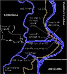 To tell the story of Old River we have to change clocks. Our normal perspective, as we survey our world, is framed by our sense of the passage of time. Time for us passes far more quickly than it does for the Mississippi. The events that shape the Mississippi take place in geologic time. The geologic forces that shape the face of the earth are not well measured in days or even years. A century in geologic time is hardly the blink of an eye. To understand Old River we must begin by winding back the geologic clock through a few dozen millennia. Look at a map of the state of Louisiana and you can see it is shaped something like a boot. Over the course of many millennia the bottom half of that boot has been created by the Mississippi. Southern Louisiana is built entirely of river sediment carried by water from as far away as the Rocky Mountains. As the Jefferson River gushes down a Montana mountainside it picks up little bits of that mountain and carts them off to the Missouri River. As the Wabash flows through prime Indiana farm land it picks up some of that land and carries it to the Ohio River. The process is cumulative until finally, the Mississippi, loaded with two million tons per day of washed away mountain and farm field, reaches sea level and slows down enough to unburden its load in southern Louisiana. To build up all of southern Louisiana, the Mississippi has had to move around. Every couple of millennia it takes a major turn, abandons it's old channel, and finds a new one. The last time this happened was at the site where Donaldsonville now sits. Bayou Lafourche used to be the Mississippi. The next time this will happen will be at Old River.
