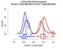 Below we useDW-NOMINATE Common Space scores to plot the ideological positions of members of current, 113th Congress. We use Common Space scores because they allow for direct comparability between members of the House and Senate. The ideological distributions of Democrats and Republicans in the House are shown with the light blue and red lines, while Senate Democrats and Republicans are plotted using the dark blue and red lines.