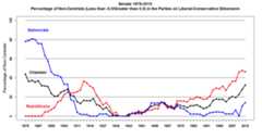 Below are the Party mean graphs for the House and second for the secondDW-NOMINATE dimension. This dimension usually picks up regional differences between the two major parties. Before the Civil War the second dimension picked up the North vs. South division on Slavery. In the Post Reconstruction period the second dimension picked up regional differences on soft vs. hard Money (bimetalism, gold and silver) and beginning in the late 1930s Civil Rights. In the past 20 years the second dimension has faded in importance and issues that used to divide the parties internally — e.g., gun control, abortion — now load almost entirely on the first dimension. This is explored in detail inKeith T. Poole and Howard Rosenthal (2007)Ideology and Congress. Note that in the figures below the parties have almost converged on the secondDW-NOMINATE dimension. Voting in Congress is almost entirely one-dimensional. The first dimension now accounts for over 93-94 percent of the roll call votes.