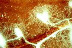 Figure 1: Hyphae of a wood-decaying fungus found growing on the underside of a fallen log. The metabolically active hyphae have secreted droplets on their surfaces. Copyright © M. Blackwell 1996.
