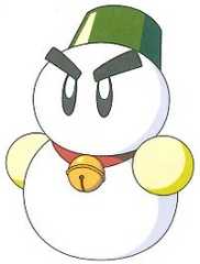 Chilly is a reoccurringenemy throughout theKirby series. His basic appearance is that of a two-segmented snowman, with the bottom segment serving as the body, and the upper as the head. He commonly wears a cylindrical bucket atop his head, and a collar with a bell around his neck. He also has two black eyes with thick eyebrows. Chilly himself has never possessed an incredibly major role in anyKirby game, commonly appearing as a basic enemy or as ahelper, and most notably givingKirby theIce orFreezeCopy Ability. He is usually, although not always, found in very cold or snowy areas.