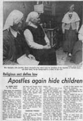 The local social welfare authorities gathered information about the children at St-Jovite and prepared to act. On December 28, 1966, around fifty policemen raided the church compound. Still, knowing that something was about to happen, by then, the Apostles had moved most of the children from St-Jovite and placed them in homes of adherents and sympathizers in Canada and the United States. “The Hidden Children,” as they were called in the media, [Image at right] numbered about eighty.