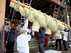 迎春準備、重さ250キロの大しめ縄付け替え 福井市の出雲大社福井分院