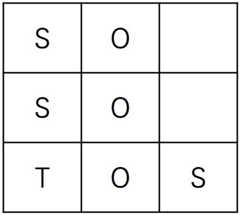 다음과 같이 3x3 크기의 복도의 정보가 주어진 상황을 확인해보자. 본 문제에서 위치 값을 나타낼 때는 (행,열)의 형태로 표현한다. 선생님이 존재하는 칸은 T, 학생이 존재하는 칸은 S, 장애물이 존재하는 칸은 O로 표시하였다. 아래 그림과 같이 (3,1)의 위치에는 선생님이 존재하며 (1,1), (2,1), (3,3)의 위치에는 학생이 존재한다. 그리고 (1,2), (2,2), (3,2)의 위치에는 장애물이 존재한다.