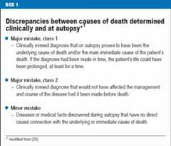 Numerous studies have differentiated and operationalized the discrepancies between clinically determined cause of death and that determined at autopsy (major mistake, class 1; major mistake, class 2; minor mistake) (Box 1gifppt). According to various statistics, class 1 major mistakes, which have consequences for treatment and survival of the patient, occur in 11% to 25% of deaths, while class 2 major mistakes, which have no consequences for treatment and survival, occur in 17% to 40% of deaths (9).