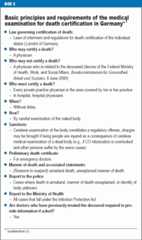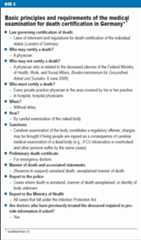 Various regulations relating to the certification of death in different states (Länder) in Germany, and a draft outline for a federal-wide death certification process from the German Medical Association, envisage explicitly that attestation of a natural death requires examination of the naked body (e4). Section 3 of the Bavarian Interment Regulations, for example, says, “[…] determination of a natural death requires in every case that the medical external examination on which the death certificate is based be carried out with the body of the deceased completely undressed. This examination of the completely undressed body shall include all regions of the body including all body orifices, the back, and the scalp.”
