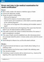 If the cause of death cannot be established from external examination of the corpse or from interviewing any doctors previously involved in treatment, this should be recorded and the manner of death entered as unexplained. With old people, the question is always whether the history and severity of the diagnosed disease explain why death occurred here and at this particular moment. Mistakes and risks in medical examination of the body are summarized inBox 5 (gifppt).