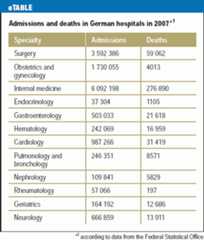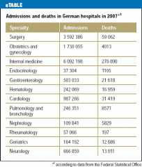 In 2007, of 17 178 573 inpatient admissions, 6 092 198 were cases belonging to the field of internal medicine. The second largest number of admissions—3 592 386 patients—were to departments of surgery. Within internal medical departments, most deaths were in cardiology, followed in order by gastroenterology, hematology, and geriatrics (eTablegifppt,eFiguregifppt). Out of a total of 818 271 deaths in 2007, 258 684 were due to cardiovascular conditions, the most common of which was ischemic heart disease (148 641 deaths). The second most common group of causes of death is malignant neoplasms, with 211 765 deaths. It should be borne in mind that deaths for the various disease groups vary considerably among age groups.