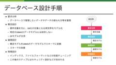 トランザクションが終わると、 データベース設計に移ります。ここでは、DB設計手順の概要を話した後に、まずは、概念設計で主流なERモデルをハンズオン付きで学んでもらい、続けて論理設計。ER図からRDBスキーマへの変換方法と正規化(BCNFまで)について話しました。