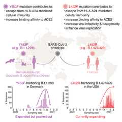 - 「懸念すべき変異株」(注6)に認定されている「カリフォルニア株(B.1.427/429系統)」と「インド株(B.1.617系統;デルタ型)」に共通するスパイクタンパク質の「L452R変異」が、HLA-A24を介した細胞性免疫から逃避することを明らかにした。